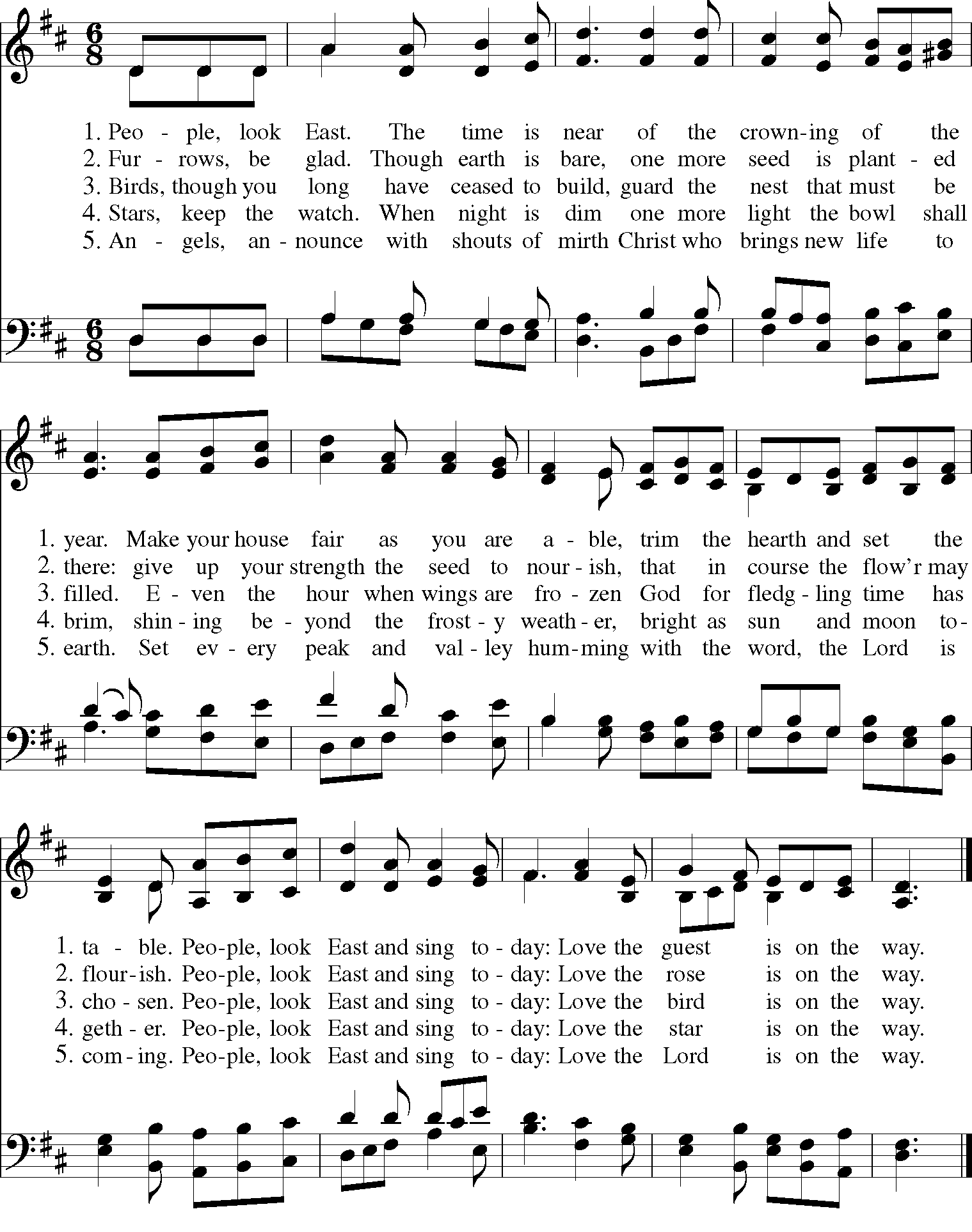 Stanza 1 sung by Soloist; Stanza 2 sung by choir; Stanzas 3 -6 sung by all.